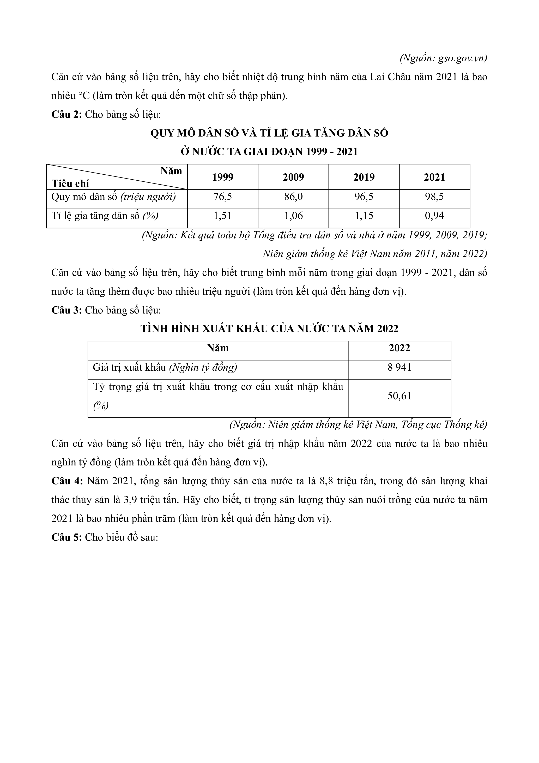 Câu 1: Cho bảng số liệu: