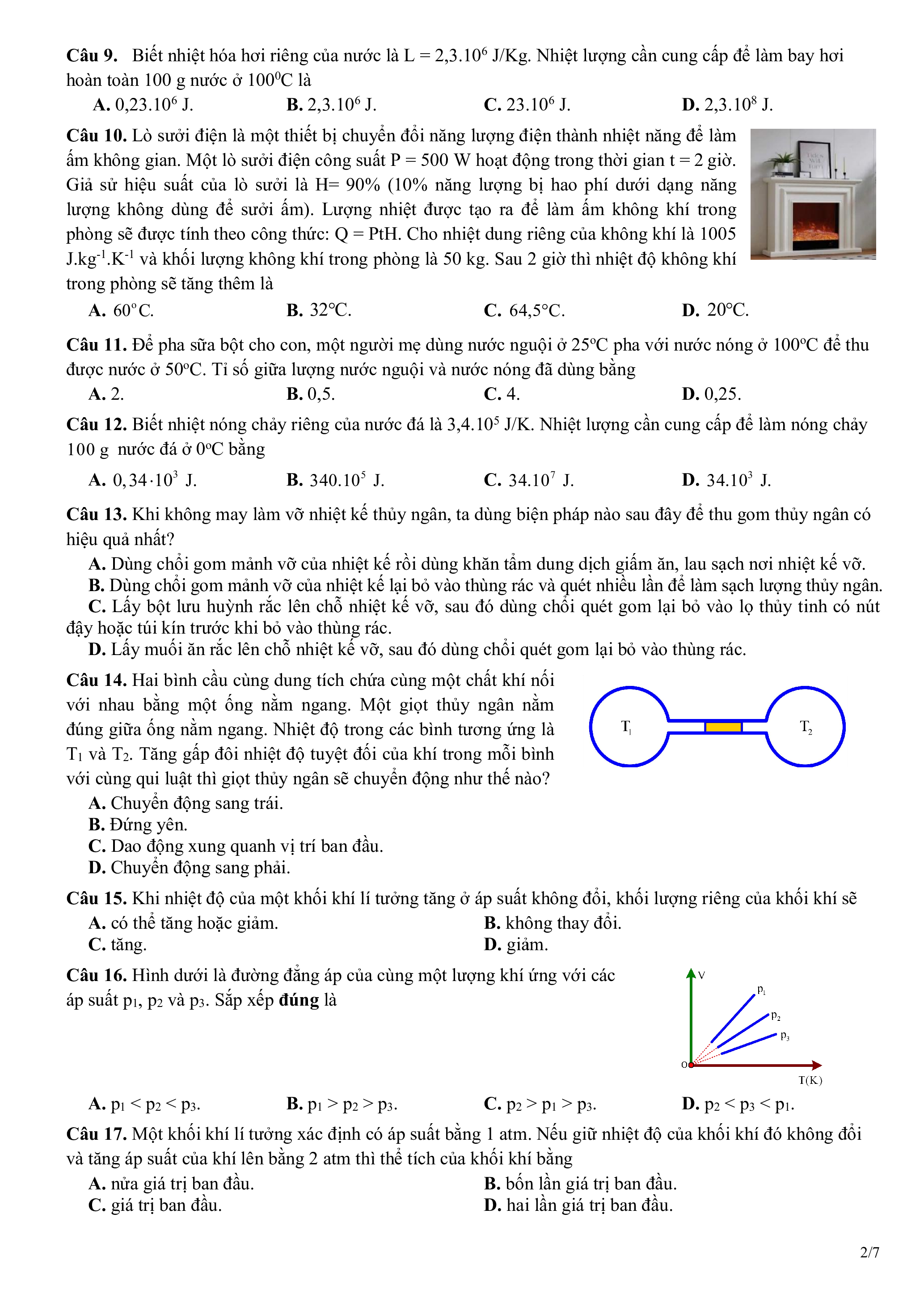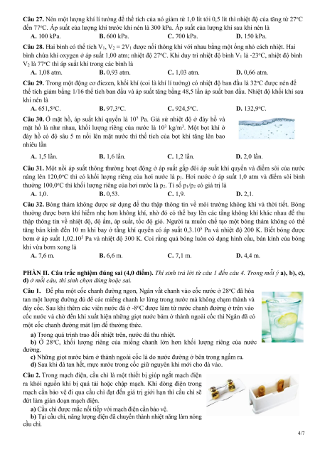 Câu 27. Nén một lượng khí lí tưởng để thể tích của nó giảm từ 1,0 lít tới 0,5 lít thì nhiệt độ của tăng từ 27oC
