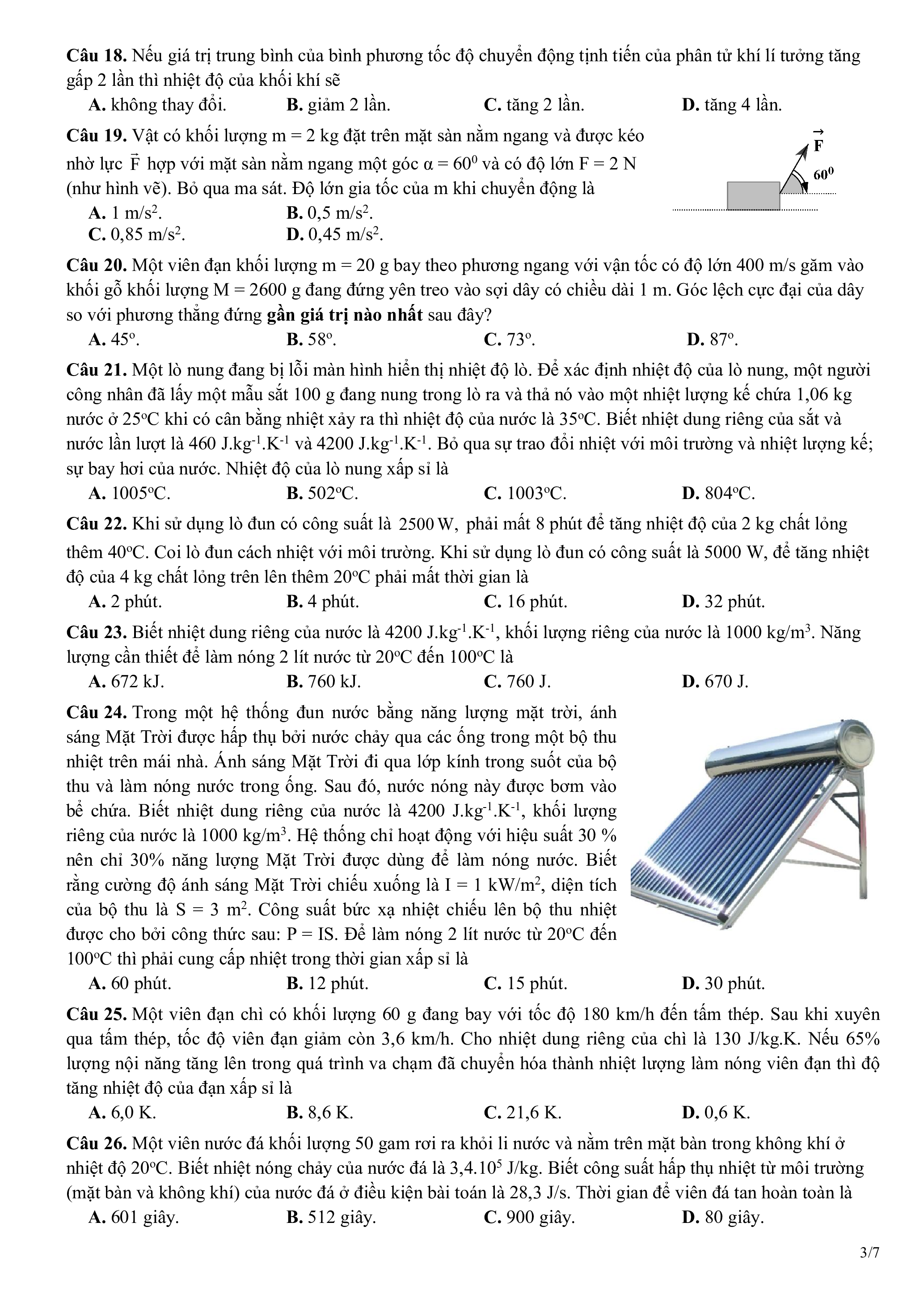 Câu 24. Trong một hệ thống đun nước bằng năng lượng mặt trời, ánh