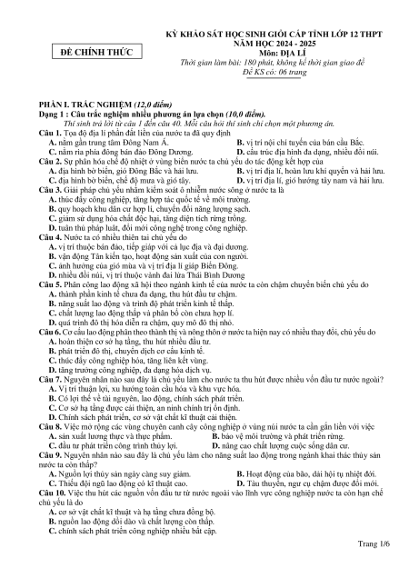 KỲ KHẢO SÁT HỌC SINH GIỎI CẤP TỈNH LỚP 12 THPT NĂM HỌC 2024 - 2025 ĐỀ CHÍNH THỨC Môn: ĐỊA LÍ