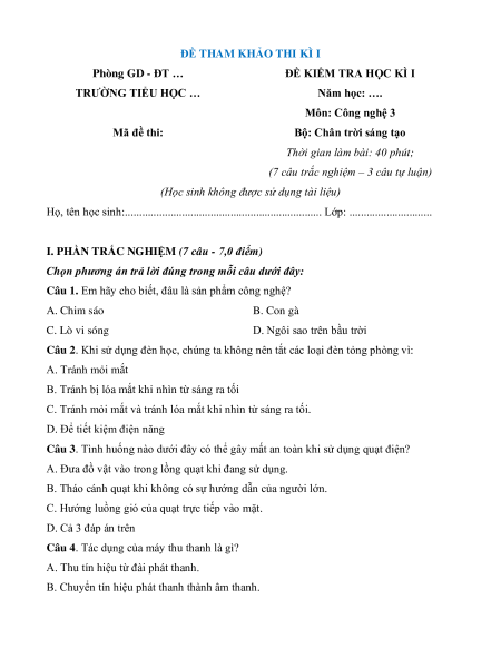 3 Đề thi cuối kì 1 Công nghệ lớp 3 Chân trời sáng tạo có đáp án