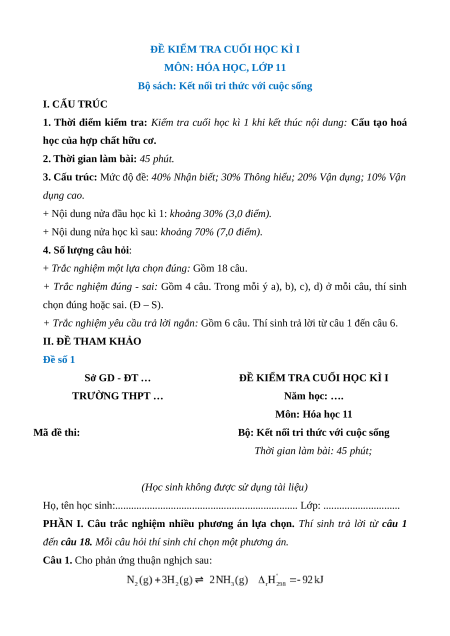 - Tailieugiaovien.com.vn giới thiệu bộ 3 đề thi Cuối kì 1 Cấu trúc mới 2025 có đầy đủ ma trận và lời giải chi tiết Hóa học 11 Kết nối tri thức nhằm giúp Giáo viên có thêm tài liệu tham khảo ra đề thi Hóa 11.