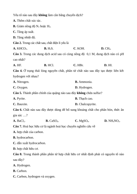 Câu 5. Thành phần chính của quặng nào sau đây không chứa sulfur? A. Pyrite. B. Thạch cao. C. Bauxite. D. Chalcopyrite.