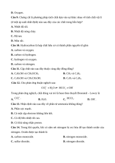 Câu 9. Chưng cất là phương pháp tách chất dựa vào sự khác nhau về tính chất vật lí