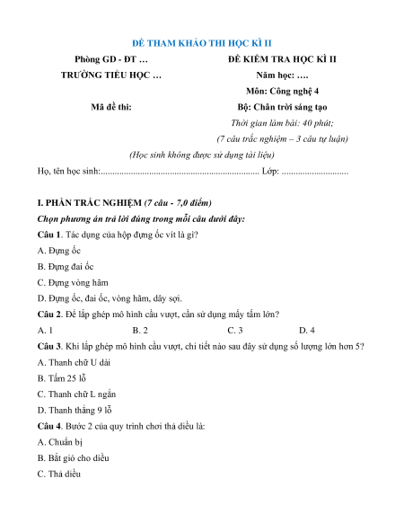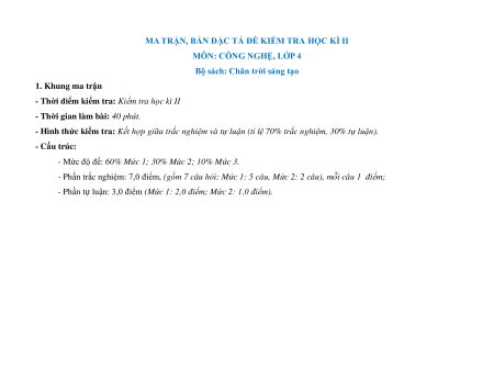 - Tailieugiaovien.com.vn giới thiệu bộ 3 đề cuối kì 2 gồm đầy đủ ma trận và lời giải chi tiết môn Công nghệ lớp 4 Chân trời sáng tạo mới nhất năm 2024 nhằm giúp Giáo viên có thêm tài liệu tham khảo ra đề thi Công nghệ lớp 4.