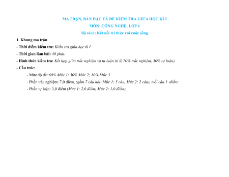 - Tailieugiaovien.com.vn giới thiệu bộ 3 đề giữa kì 1 gồm đầy đủ ma trận và lời giải chi tiết môn Công nghệ lớp 4 Kết nối tri thức mới nhất nhằm giúp Giáo viên có thêm tài liệu tham khảo ra đề thi Công nghệ lớp 4.