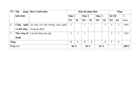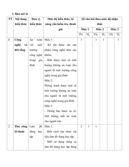 Thủ công kĩ Làm đồ dùng học tập 2 1 1 3 1 40% thuật Tổng 5 1 2 1 1 7 3 Tỉ lệ (%) 60 % 30 % 10 % 100% 2. Bản mô tả TT Nội dung Đơn vị