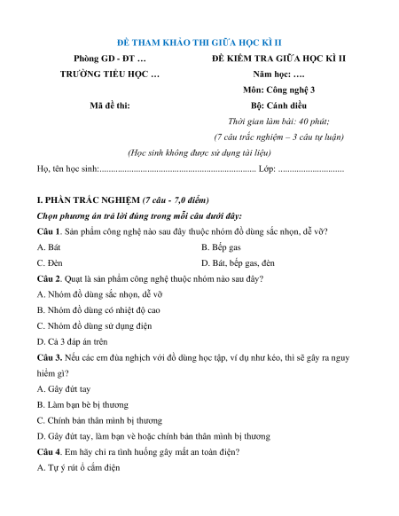 - Tailieugiaovien.com.vn giới thiệu 3 đề giữa kì 2 gồm đầy đủ ma trận và lời giải chi tiết môn Công nghệ lớp 3 Cánh diều mới nhất nhằm giúp Giáo viên có thêm tài liệu tham khảo ra đề thi Công nghệ lớp 3.