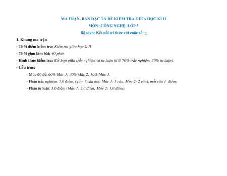 - Tailieugiaovien.com.vn giới thiệu 3 đề giữa kì 2 gồm đầy đủ ma trận và lời giải chi tiết môn Công nghệ lớp 3 Kết nối tri thức mới nhất nhằm giúp Giáo viên có thêm tài liệu tham khảo ra đề thi Công nghệ lớp 3.