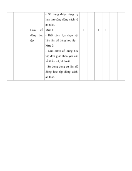 Thủ công kĩ Dụng cụ và vật liệu làm thủ công 2 1 2 1 30% thuật Làm đồ dùng học tập 1 1 1 2 1 30% Tổng 5 1 2 1 1 7 3 Tỉ lệ (%) 60 % 30 % 10 % 100% 2. Bản mô tả TT Nội dung Đơn vị