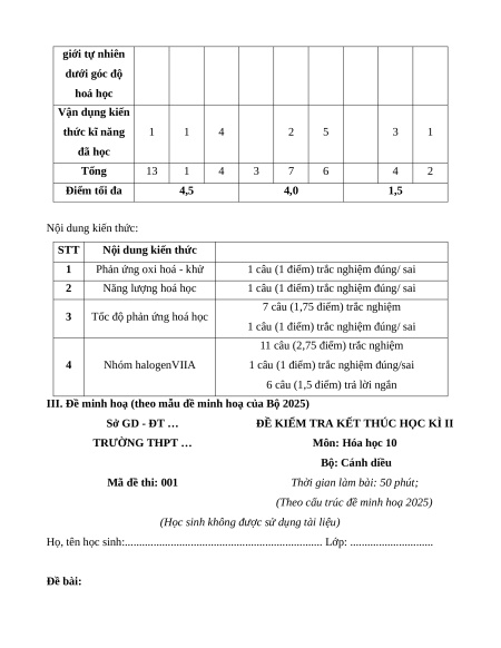- Tailieugiaovien.com.vn giới thiệu bộ 3 đề thi Hóa học 10 Cuối học kì 2 Cánh diều cấu trúc mới 2025 nhằm giúp Giáo viên có thêm tài liệu tham khảo ra đề thi Hóa học lớp 10.
