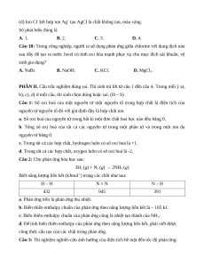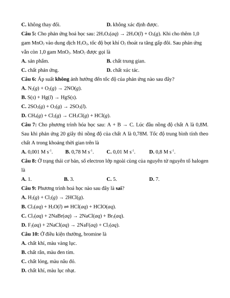 Câu 5: Cho phản ứng hoá học sau: 2H2O2(aq) → 2H2O(l) + O2(g). Khi cho thêm 1,0