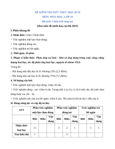một lựa chọn đúng đúng/sai lời ngắn Vận Vận Vận Biết Hiểu Biết Hiểu Biết Hiểu dụng dụng dụng Nhận thức 11 3 2 1 1 1 hoá học Tìm hiểu thế 1 3 giới tự nhiên dưới góc độ hoá học Vận dụng kiến thức kĩ năng 1 1 4 2 5 3 1 đã học Tổng 13 1 4 3 7 6 4 2 Điểm tối đa 4,5 4,0 1,5 Nội dung kiến thức: STT