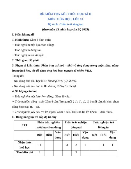 - Tailieugiaovien.com.vn giới thiệu bộ 3 đề thi Hóa học 10 Cuối học kì 2 Chân trời sáng tạo cấu trúc mới 2025 nhằm giúp Giáo viên có thêm tài liệu tham khảo ra đề thi Hóa học lớp 10.