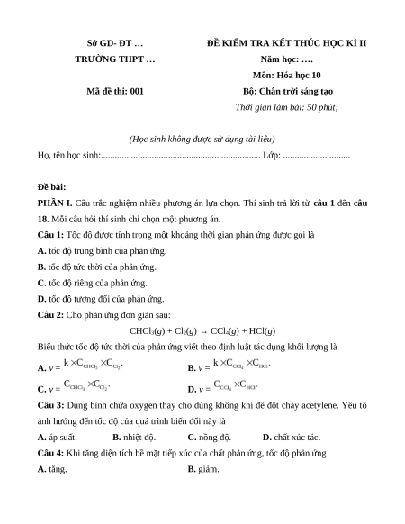 ĐỀ KIỂM TRA KẾT THÚC HỌC KÌ II TRƯỜNG THPT … Năm học: …. Môn: Hóa học 10 Mã đề thi: 001