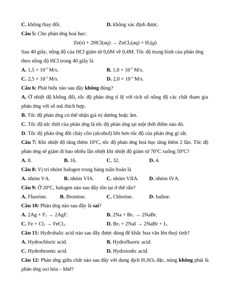 Câu 4: Khi tăng diện tích bề mặt tiếp xúc của chất phản ứng, tốc độ phản ứng A. tăng. B. giảm. C. không thay đổi.