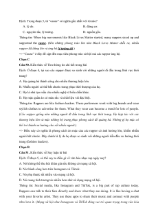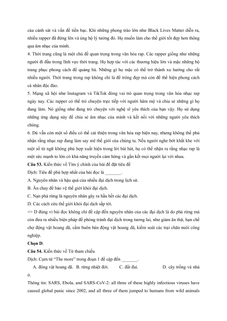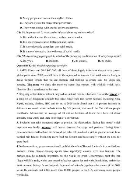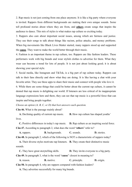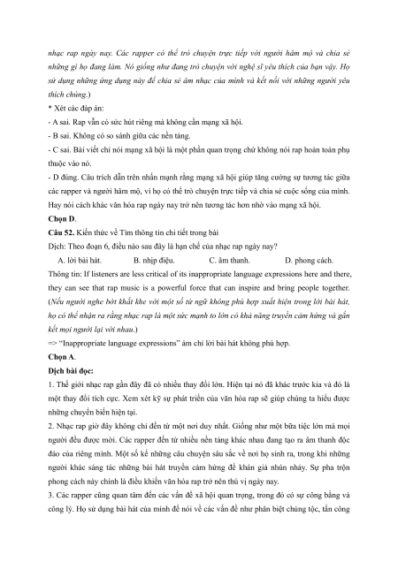 Câu 52. According to paragraph 6, which of the following is a limitation of today’s rap music? A. its lyrics. B. its beats. C. its sounds. D. its styles.