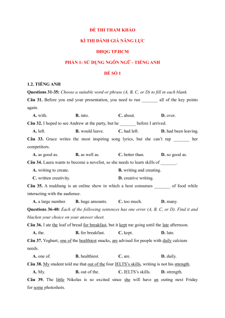 PHẦN 1: SỬ DỤNG NGÔN NGỮ - TIẾNG ANH ĐỀ SỐ 1 1.2. TIẾNG ANH
