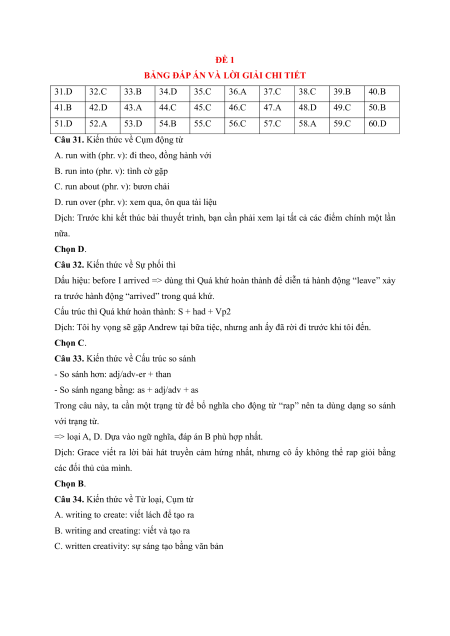 Câu 31. Before you end your presentation, you need to run _______ all of the key points again. A. with. B. into. C. about. D. over.