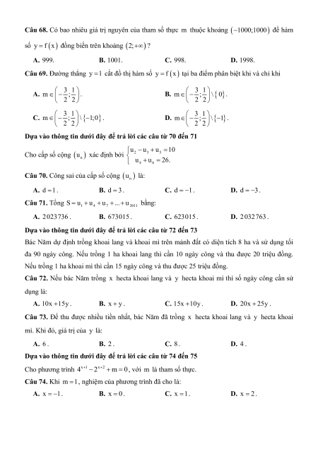 Câu 68. Có bao nhiêu giá trị nguyên của tham số thực m thuộc khoảng 1000;1000 để hàm