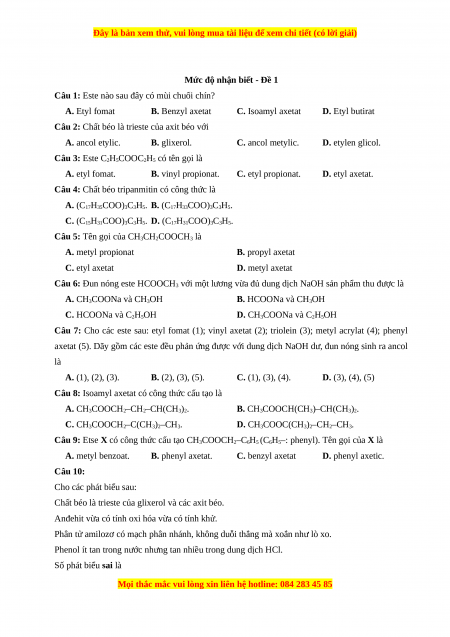 Câu 1: Este nào sau đây có mùi chuối chín? A. Etyl fomat B. Benzyl axetat C. Isoamyl axetat D. Etyl butirat