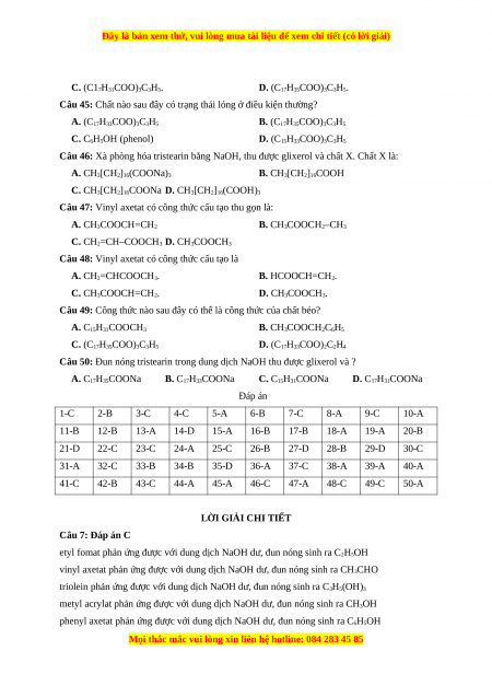 Câu 43: Xà phòng hóa chất nào sau đây thu được glixerol A. Benzyl axetat B. Metyl fomat C. Tristearin D. Metyl axetat