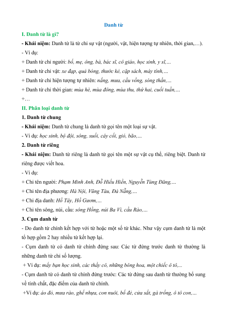 - Khái niệm: Danh từ là từ chỉ sự vật (người, vật, hiện tượng tự nhiên, thời gian,…). - Ví dụ: