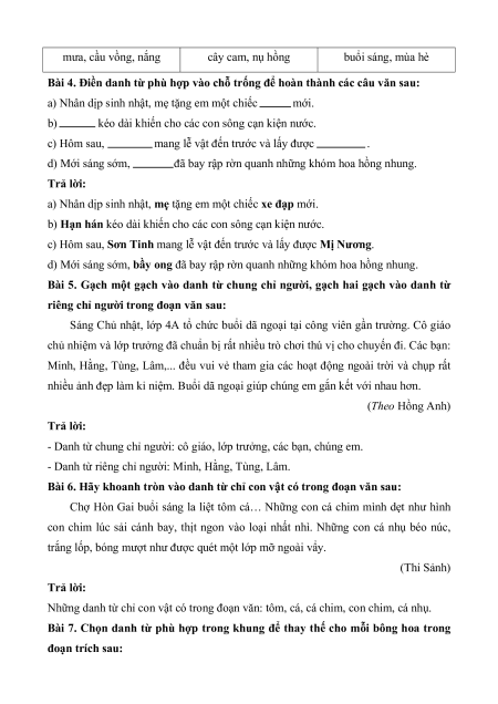 Bài 4. Điền danh từ phù hợp vào chỗ trống để hoàn thành các câu văn sau: