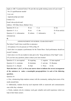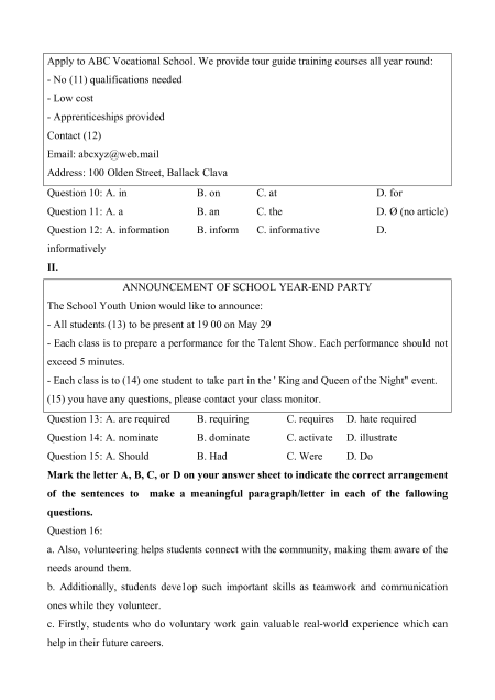 Address: 100 Olden Street, Ballack Clava Question 10: A. in B. on C. at D. for Question 11: A. a B. an C. the D. Ø (no article) Question 12: A. information B. inform C. informative D. informatively II.