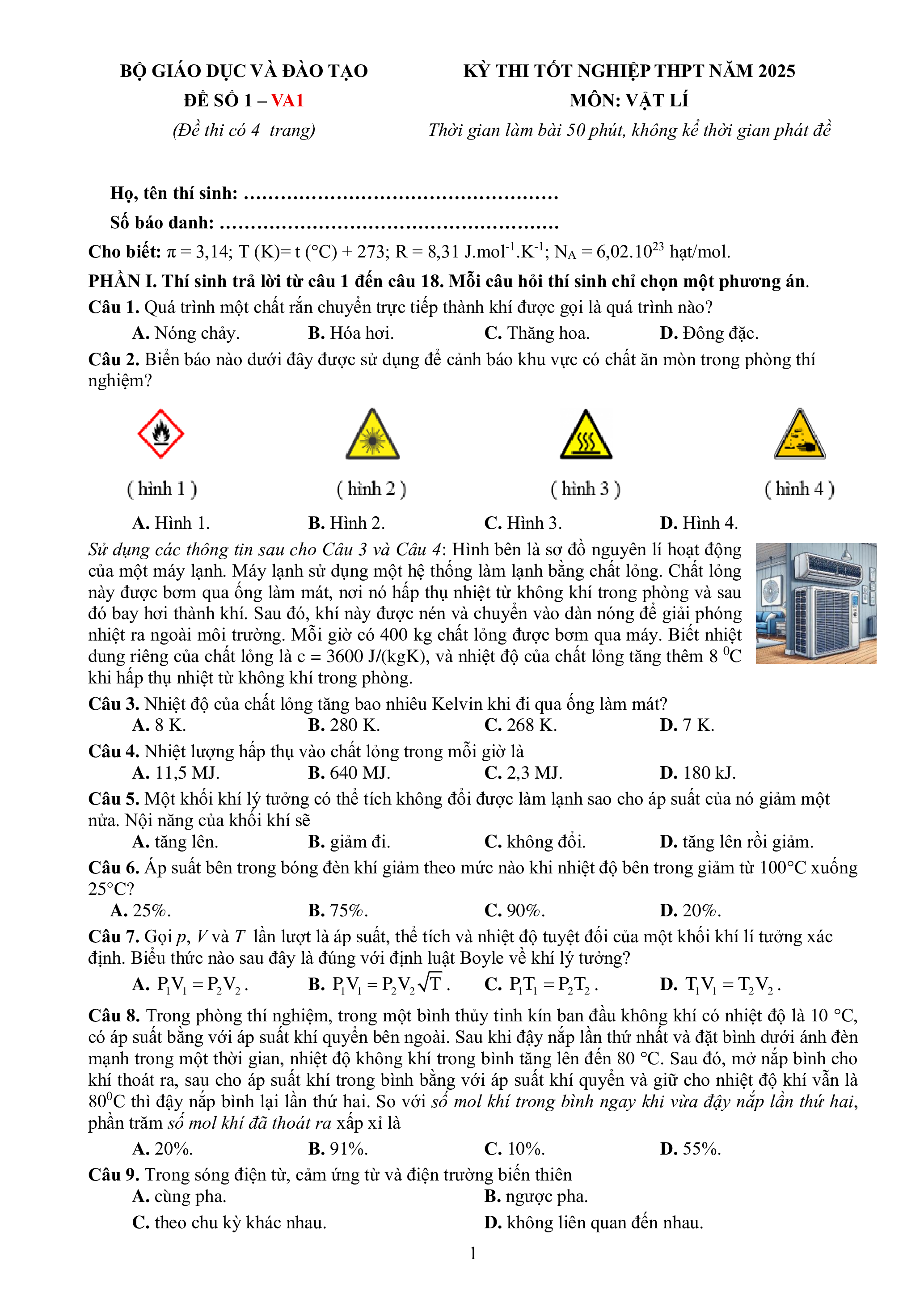 KỲ THI TỐT NGHIỆP THPT NĂM 2025 ĐỀ SỐ 1 – VA1 MÔN: VẬT LÍ