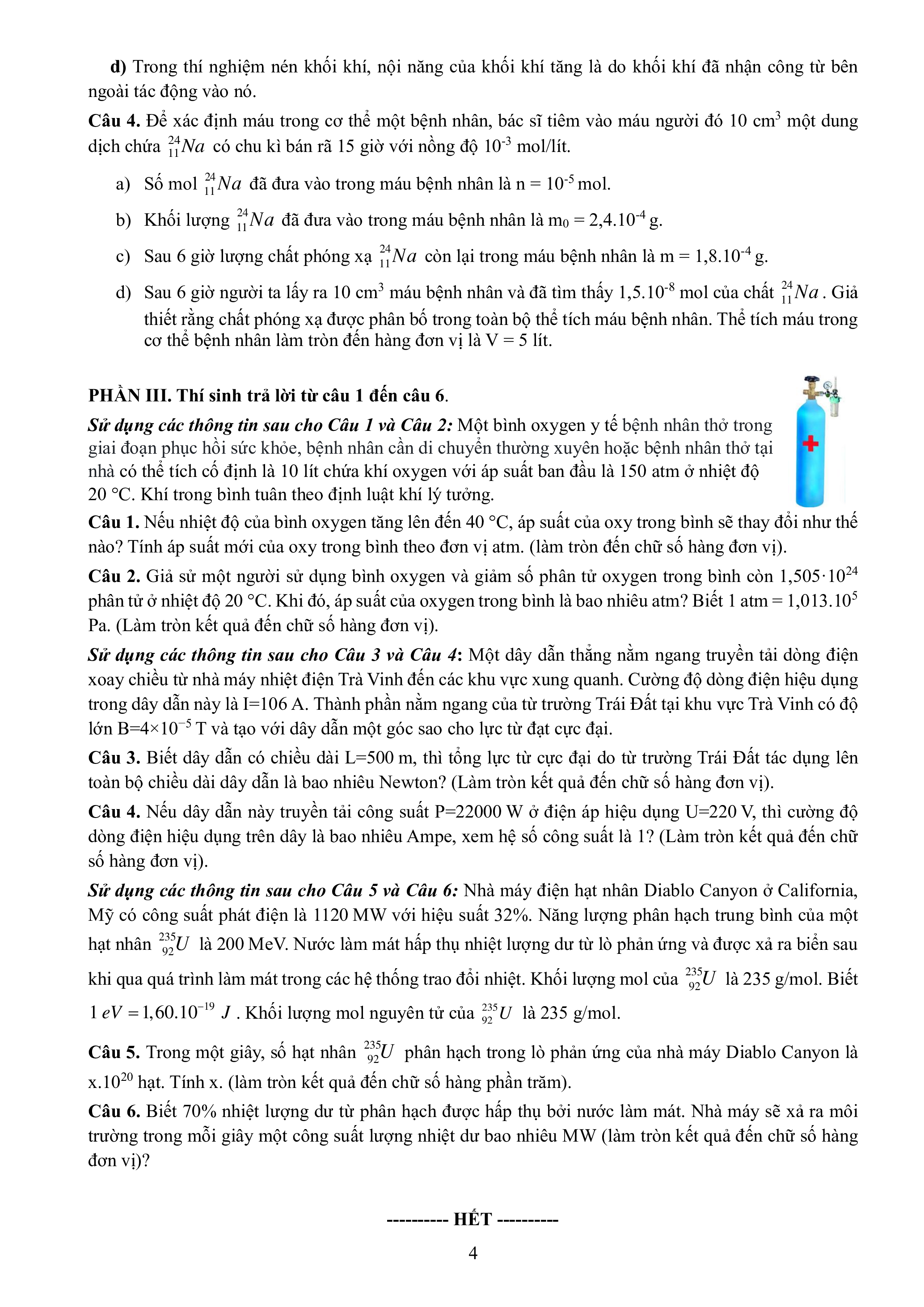 Câu 5. Trong một giây, số hạt nhân 235U phân hạch trong lò phản ứng của nhà máy Diablo Canyon là 92