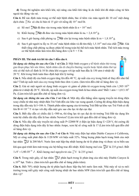Câu 5. Trong một giây, số hạt nhân 235U phân hạch trong lò phản ứng của nhà máy Diablo Canyon là 92