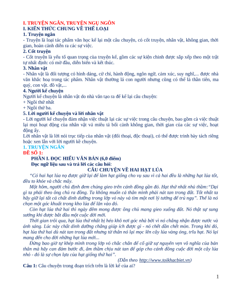 hoặc xen lẫn với lời người kề chuyện. 1. TRUYỆN NGẮN ĐỀ SỐ 1: