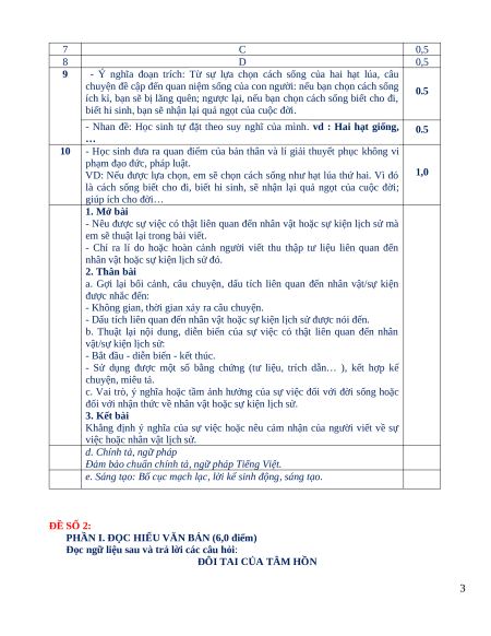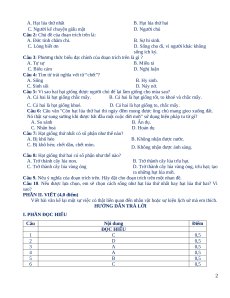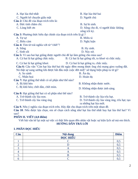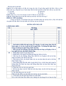 HƯỚNG DẪN TRẢ LỜI I. PHẦN ĐỌC HIỂU Câu Nội dung Điểm ĐỌC HIỂU 1 C 0,5 2 D 0,5 3 A 0,5 4 A 0,5 5 B 0,5 6 C 0,5 2 7 C 0,5 8 D 0,5 9