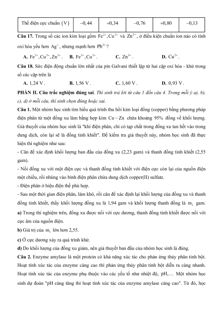 Câu 18. Sức điện động chuẩn lớn nhất của pin Galvani thiết lập từ hai cặp oxi hóa - khử trong số các cặp trên là A. 1,24 V . B. 1,56 V . C. 1,60 V . D. 0,93 V.
