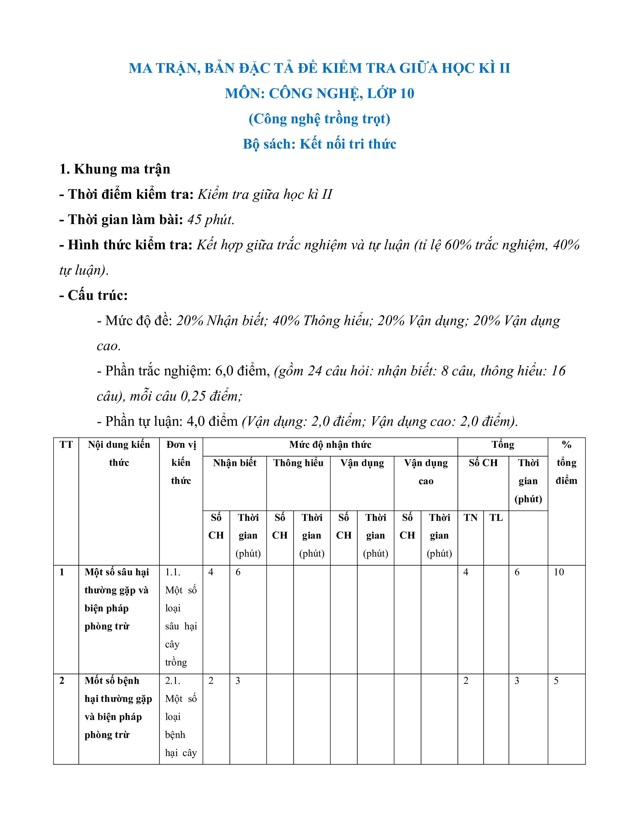Mức độ nhận thức Tổng % thức kiến Nhận biết Thông hiểu Vận dụng Vận dụng Số CH Thời tổng thức cao gian điểm (phút) Số Thời Số Thời Số Thời Số Thời TN TL CH gian CH gian CH gian CH gian (phút) (phút) (phút) (phút) 1 Một số sâu hại 1.1. 4 6 4 6 10 thường gặp và Một số biện pháp loại phòng trừ sâu hại cây trồng 2 Mốt số bệnh 2.1. 2 3 2 3 5