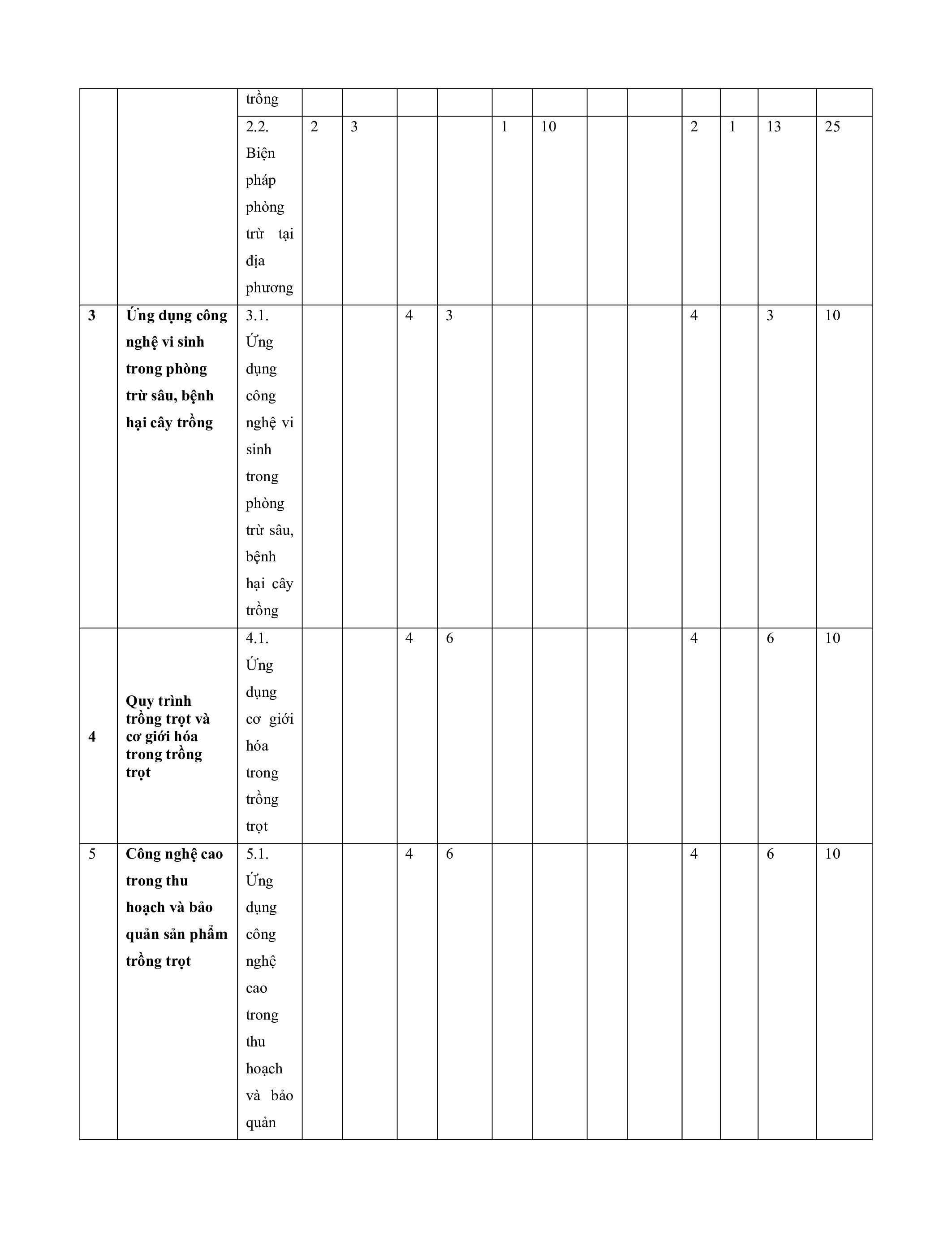 hại thường gặp Một số và biện pháp loại phòng trừ bệnh hại cây trồng 2.2. 2 3 1 10 2 1 13 25 Biện pháp phòng trừ tại địa phương 3 Ứng dụng công 3.1. 4 3 4 3 10 nghệ vi sinh Ứng trong phòng dụng trừ sâu, bệnh công hại cây trồng nghệ vi sinh trong phòng trừ sâu, bệnh hại cây trồng 4.1. 4 6 4 6 10 Ứng Quy trình dụng trồng trọt và cơ giới 4 cơ giới hóa trong trồng hóa trọt trong trồng trọt 5 Công nghệ cao 5.1. 4 6 4 6 10 trong thu Ứng hoạch và bảo dụng