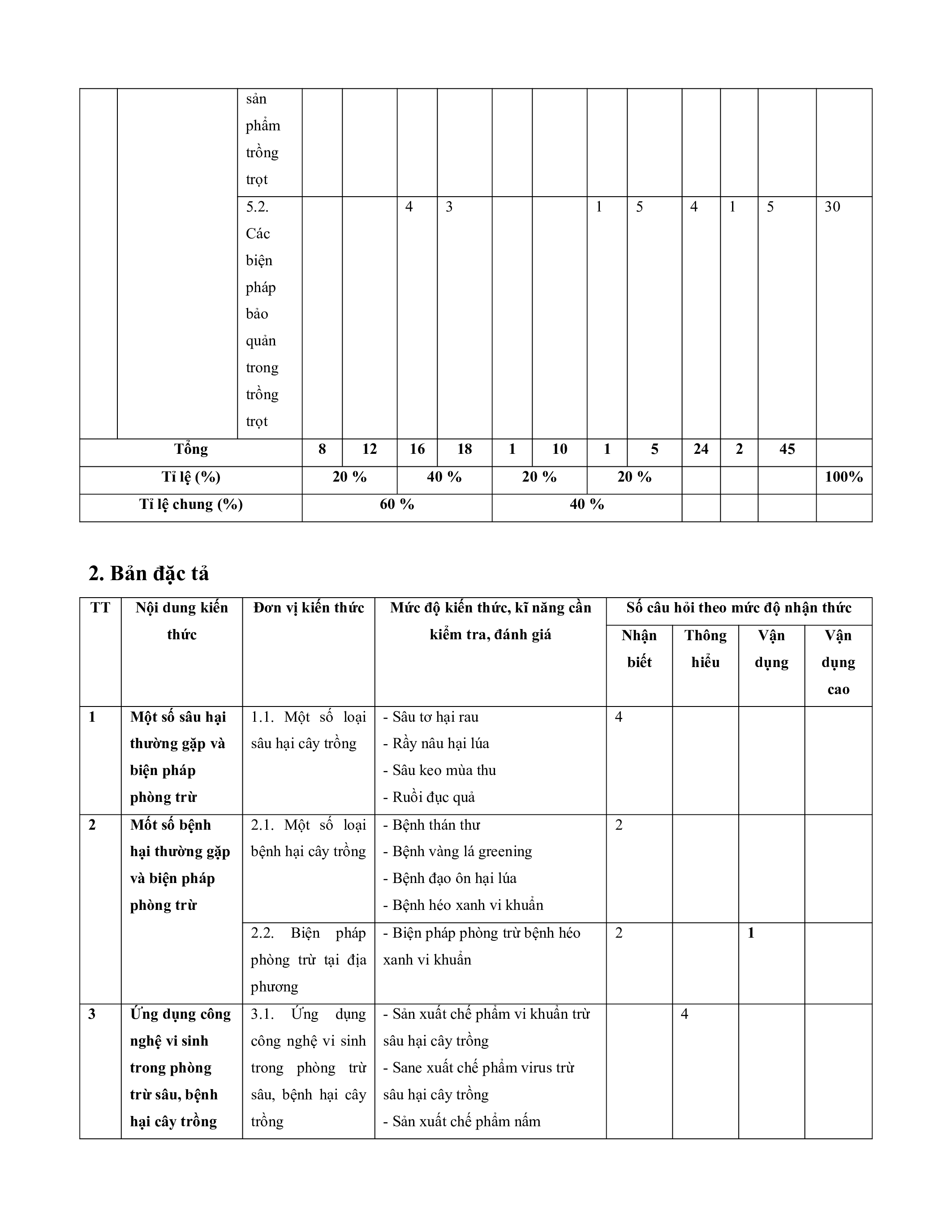 quản sản phẩm công trồng trọt nghệ cao trong thu hoạch và bảo quản sản phẩm trồng trọt 5.2. 4 3 1 5 4 1 5 30 Các biện pháp bảo quản trong trồng trọt Tổng 8 12 16 18 1 10 1 5 24 2 45 Tỉ lệ (%) 20 % 40 % 20 % 20 % 100% Tỉ lệ chung (%) 60 % 40 % 2. Bản đặc tả TT Nội dung kiến