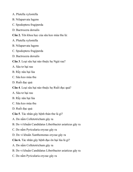 Câu 1. Tên khoa học của sâu tơ hại rau là: