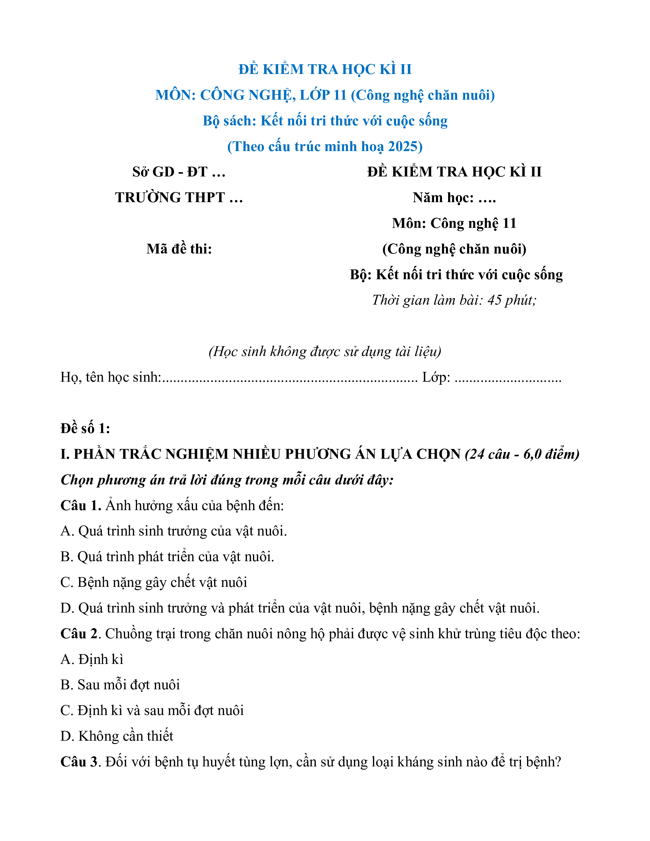5 Đề thi cuối kì 2 Công nghệ Chăn nuôi 11 Kết nối tri thức cấu trúc mới