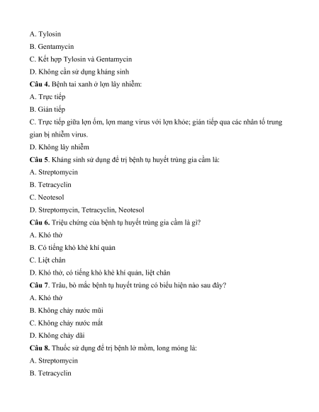 Câu 3. Đối với bệnh tụ huyết tùng lợn, cần sử dụng loại kháng sinh nào để trị bệnh? A. Tylosin B. Gentamycin