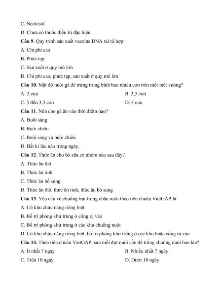 Câu 10. Mật độ nuôi gà đẻ trứng trung bình bao nhiêu con trên một mét vuông? A. 3 con B. 3,5 con C. 3 đến 3,5 con D. 4 con