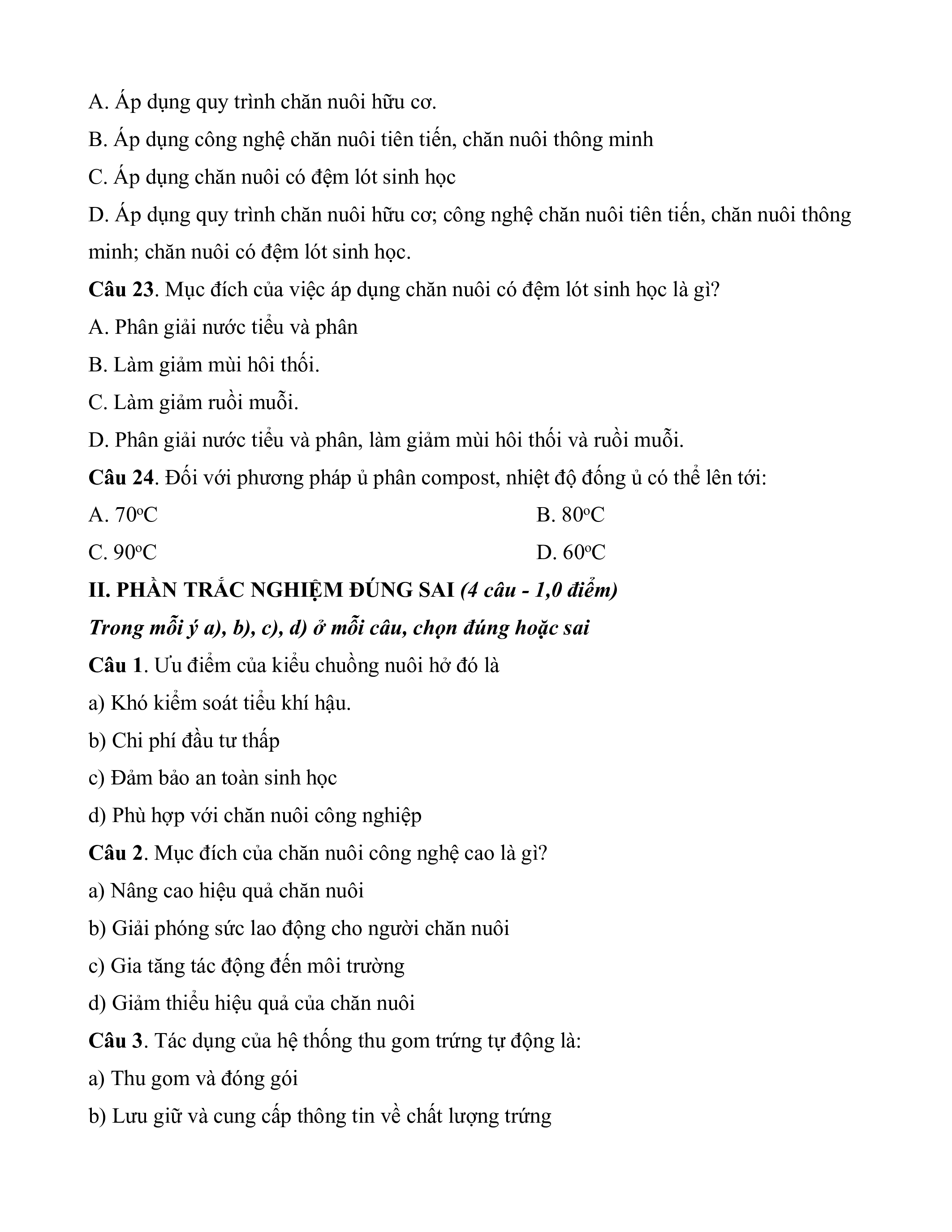Câu 2. Chuồng trại trong chăn nuôi nông hộ phải được vệ sinh khử trùng tiêu độc theo: A. Định kì B. Sau mỗi đợt nuôi