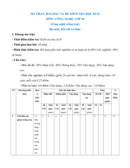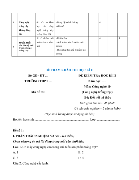 5 Đề thi cuối kì 2 Công nghệ trồng trọt 10 Kết nối tri thức