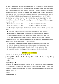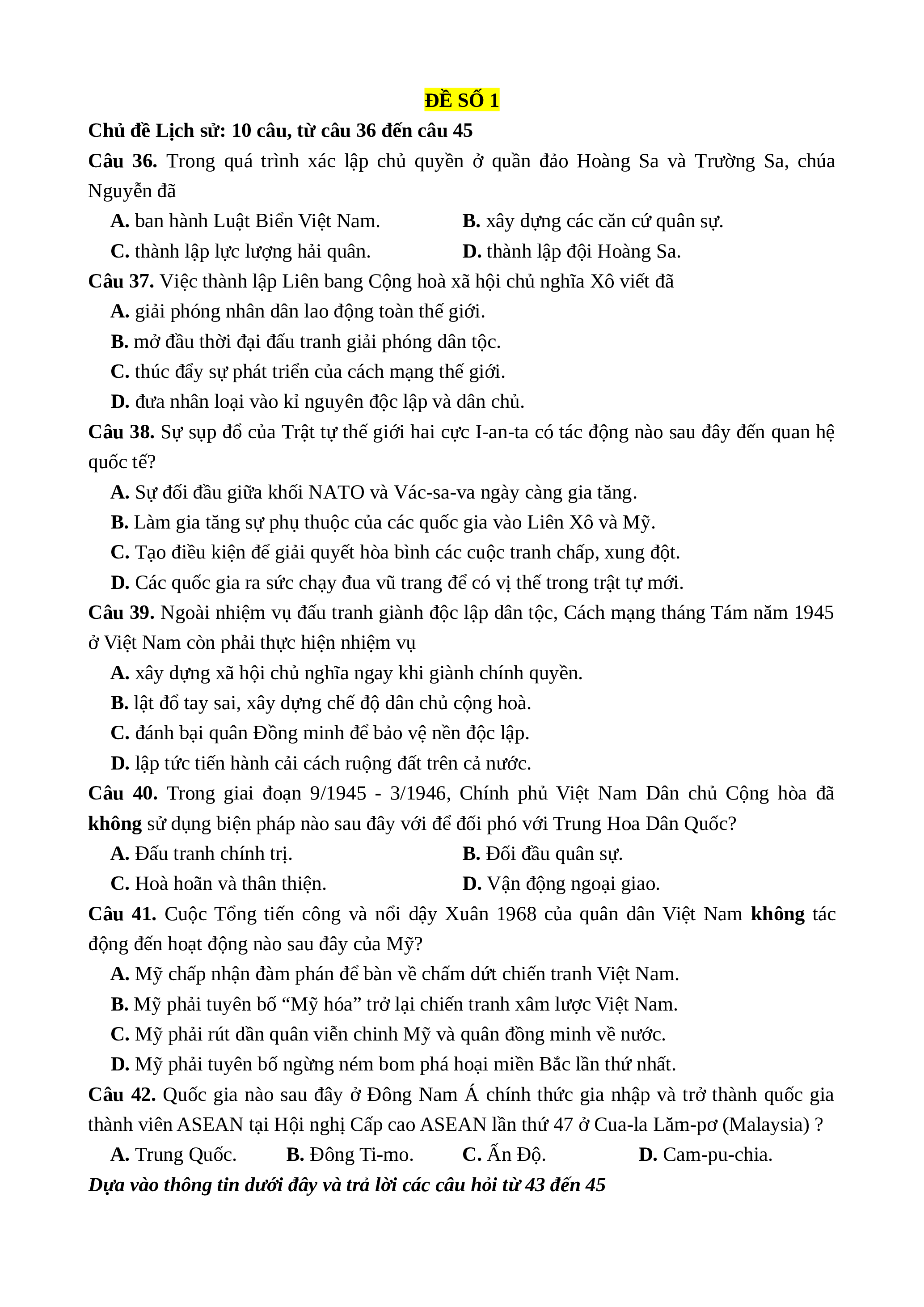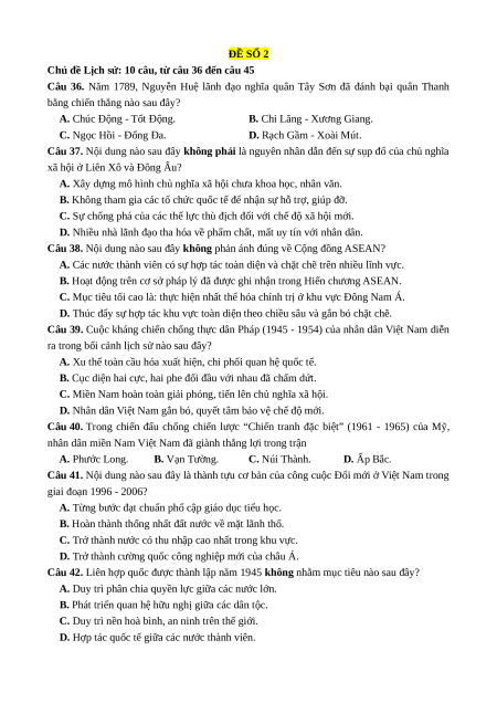 Chủ đề Lịch sử: 10 câu, từ câu 36 đến câu 45 36. D 37. C 38. C 39. B 40. B 41. B 42. B 43. C 44. C 45. B Lời giải chi tiết: Câu 36. Đáp án đúng là: D