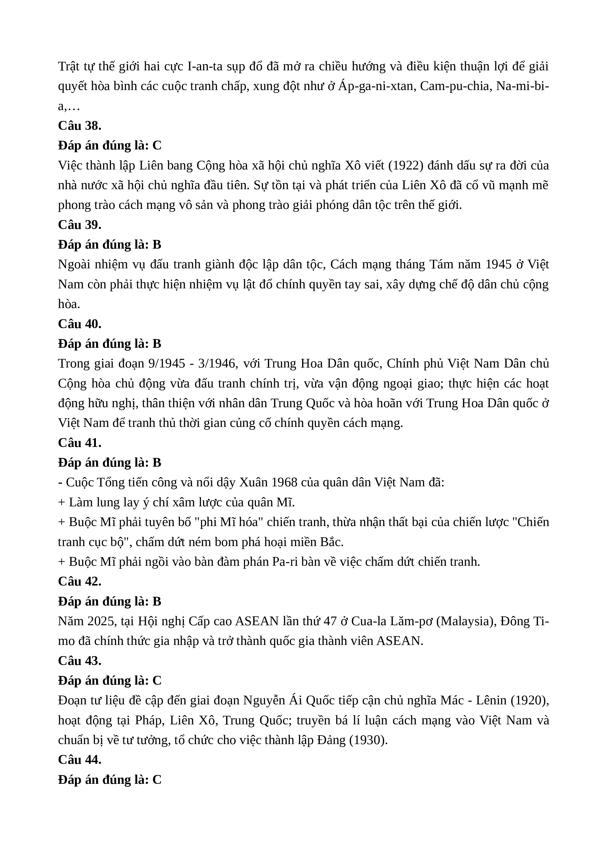 Việt Nam để tranh thủ thời gian củng cố chính quyền cách mạng. Câu 41. Đáp án đúng là: B
