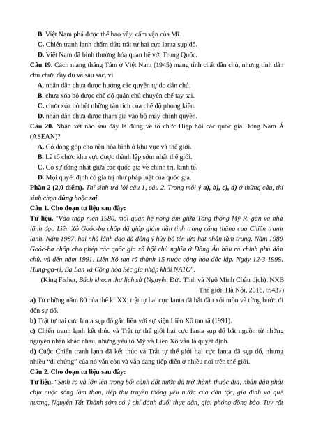 Câu 12. Sự sụp đổ của chủ nghĩa xã hội ở Liên Xô và các nước Đông Âu là sự sụp đổ của