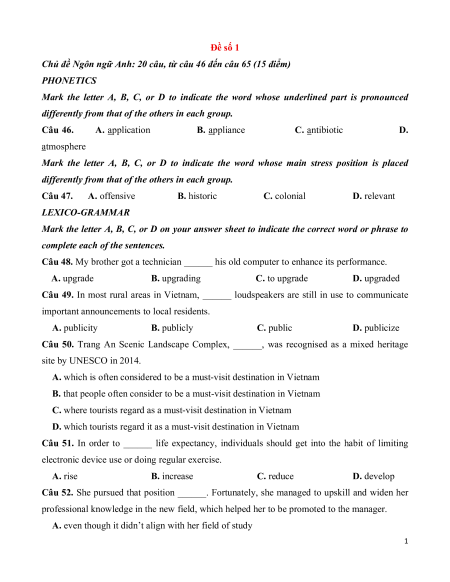 Chủ đề Ngôn ngữ Anh: 20 câu, từ câu 46 đến câu 65 (15 điểm) PHONETICS