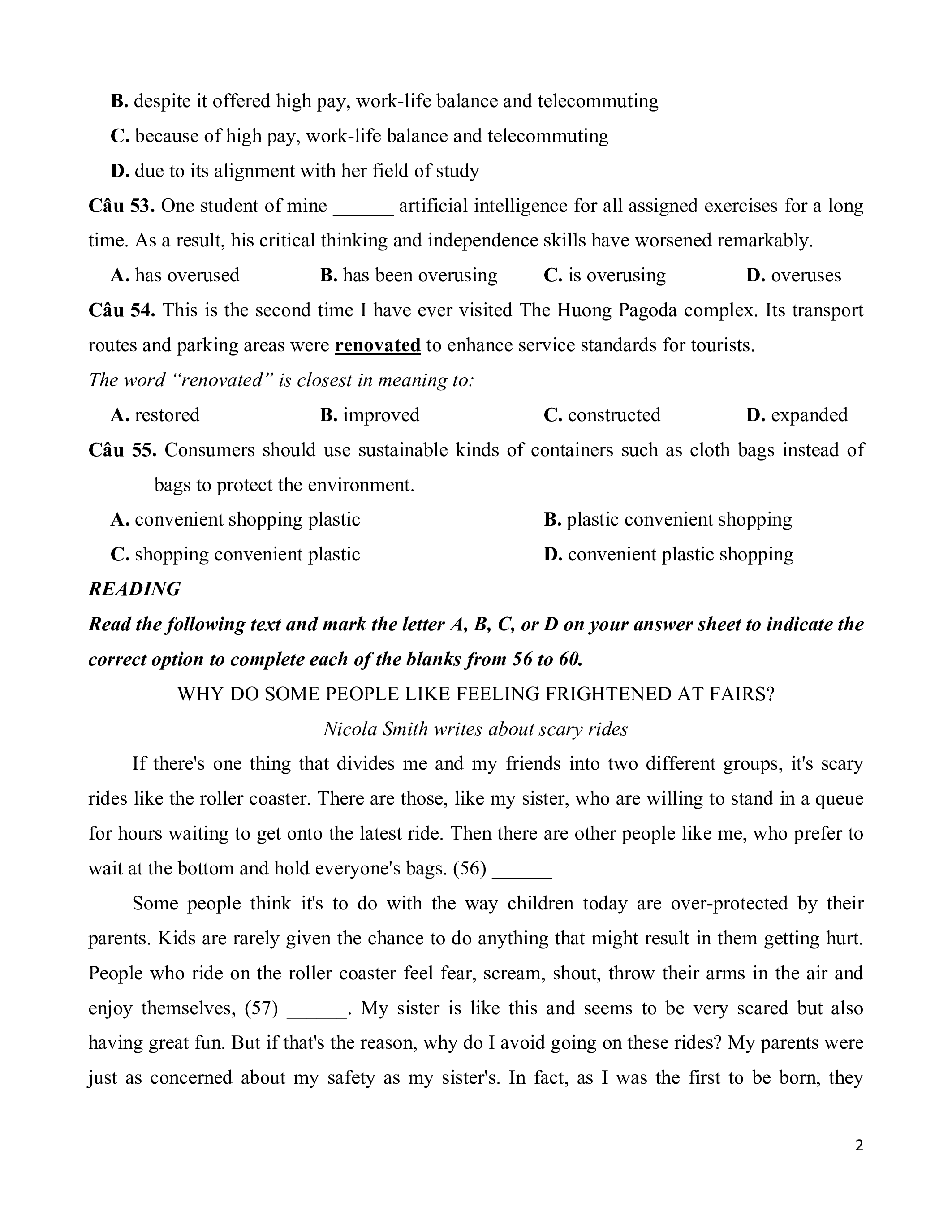Câu 55. Consumers should use sustainable kinds of containers such as cloth bags instead of