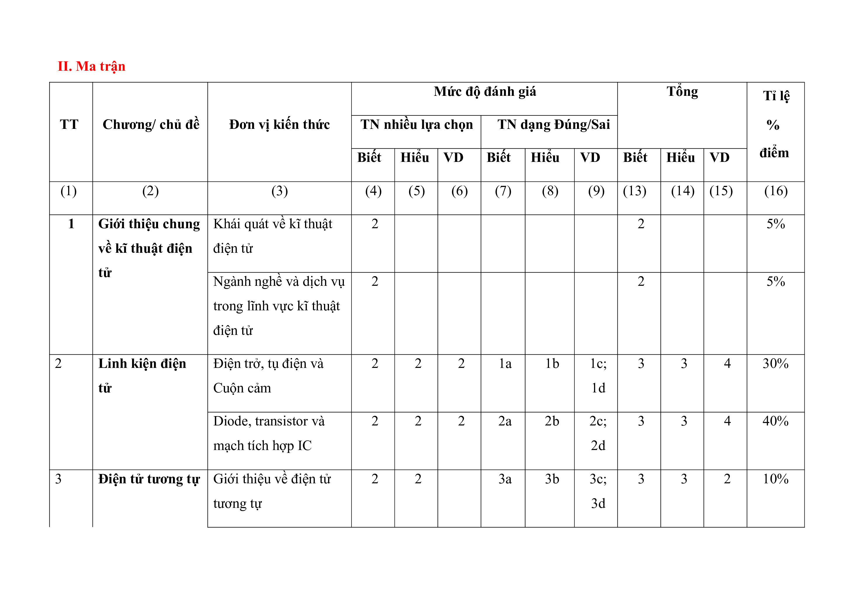 Điện tử tương tự Giới thiệu về điện tử 2 2 3a 3b 3c; 3 3 2 10% tương tự 3d Mạch khuếch đại thuật 2 2 4a 4b 4c; 3 3 2 10% toán 4d Tổng số câu 12 8 4 4 4 8 16 12 12 Tổng số điểm 6 4 4 3 3 100% Tỉ lệ % 60% 40% 40% 30% 30% 100% III. Đề kiểm tra Sở GD- ĐT …
